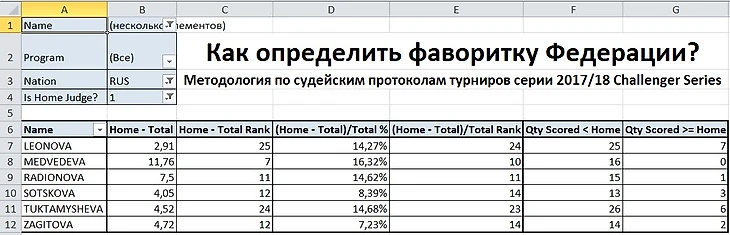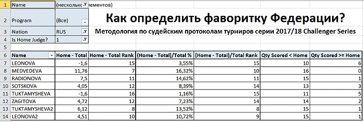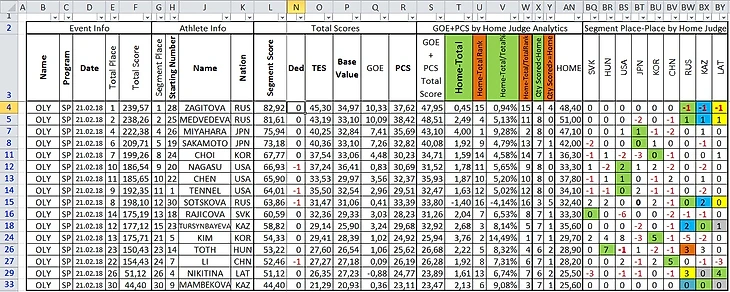 В столбце (Home - Total)/Total % указан процент пристрастности судьи из РФ к фигуристке по КП + ПП относительно протокола. Т.е. на сколько отличаются в процентах оценки по КП + ПП по мнению судьи от оценок по КП + ПП по протоколу.