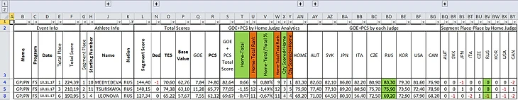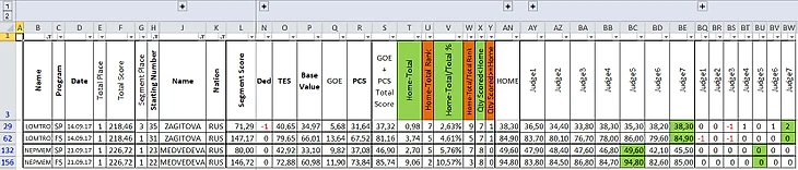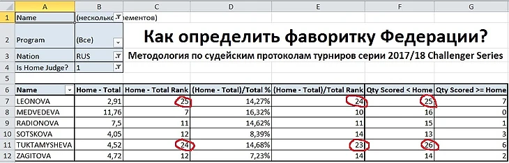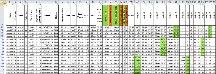 Вы, я надеюсь, уже заметили слишком большие числа в распределении и количестве судей у Туктамышевой Е. и Леоновой А.? Особенно если Вы помните детали олимпийского сезона 2017-18, то думаю уже догадались.