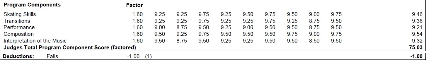 По компонентам согласен, как то странно, что вчерашняя юниорка даже с падениями получает больше за вторую оценку.