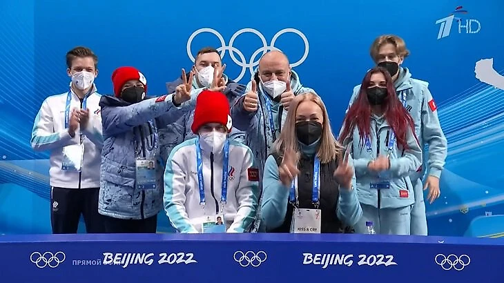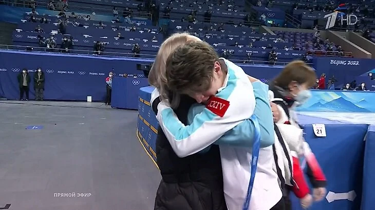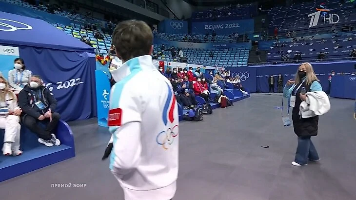 Камила Валиева сегодня отдыхает (девушки катают короткие 6 февраля), поэтому пришла в бокс поддержать остальных. Рожки от рекордсменки мира для Марка: