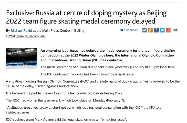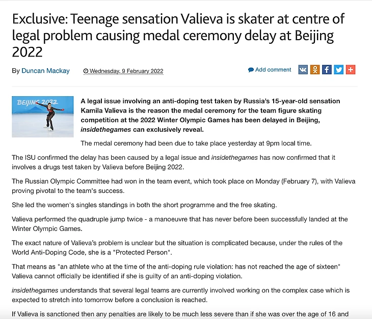Причиной переноса медальной церемонии командного турнира – допинг-тест Камилы Валиевой, пишет главный источник информации по ключевой теме дня Inside the Games.