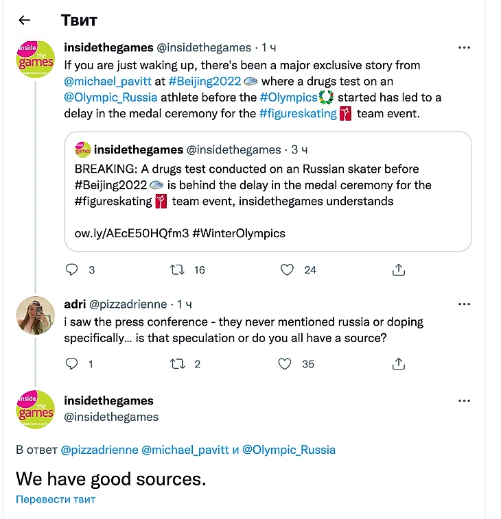 • Весь день говорили о допинге – под вечер выяснилось, что это у Камилы Валиевой Препарат от сердца, проба декабрьская, могут отнять золото в команде и исключить Камилу из личного турнира – ворох жутких новостей