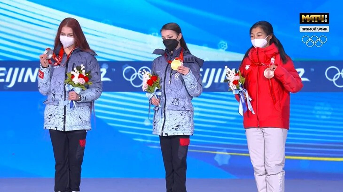 На Олимпиаде в Пекине прошла медальная церемония в женском фигурном катании: Анна Щербакова, Александра Трусова и Каори Сакамото получили награды.