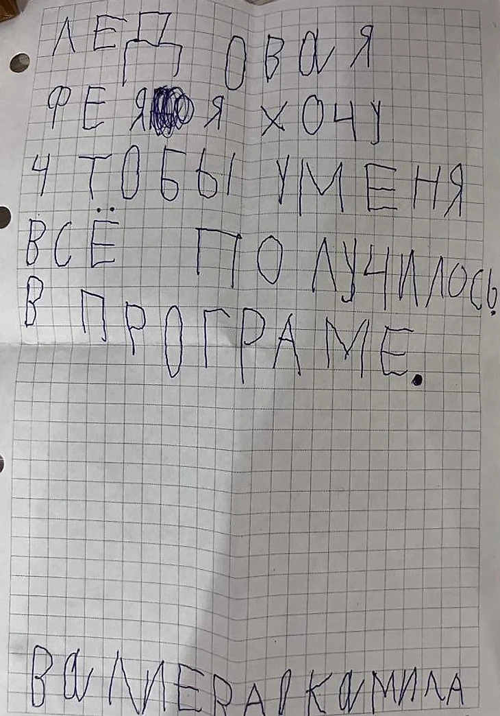 Письмо сохранила Ксения Иванова – первый тренер Камилы еще в казанском дворце спорта. Валиева жила в Казани до 7 лет, пока семья не перебралась в Москву. Именно в Татарстане она начала заниматься фигурным катанием – в 3,5 года. В школу олимпийского резерва брали с шести, поэтому до этого возраста девочка каталась в спортивно-оздоровительной группе.