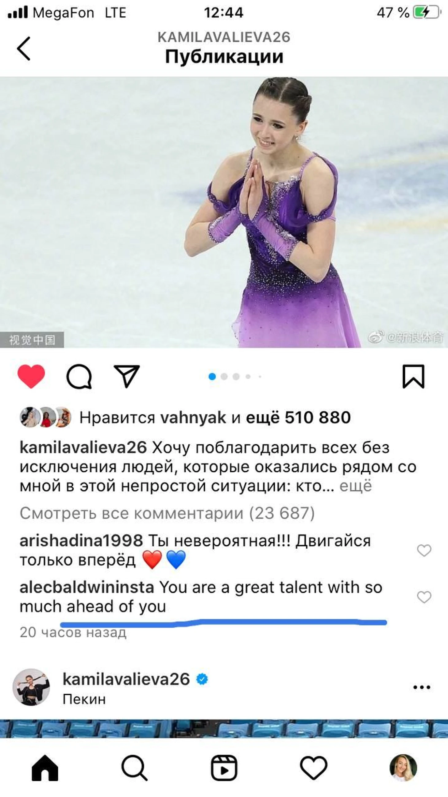 «Ты – большой талант, у тебя столько всего впереди», – написал Болдуин в комментариях к посту Валиевой в инстаграме.