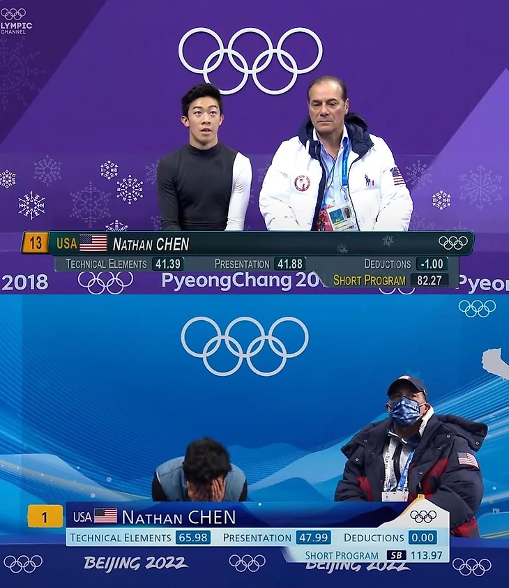 Пхенчхан-2018: падение, два степаута, 82 балла, 17-е итоговое место. Пекин-2022: сложнейший в истории, идеально выполненный технический контент, почти 114 баллов, мировой рекорд. Судьи наконец-то сдались и отдали последний недостающий рекорд Чену, который снова поставил на карту всё – но спустя 4 года он уже был ГОТОВ исполнить это.