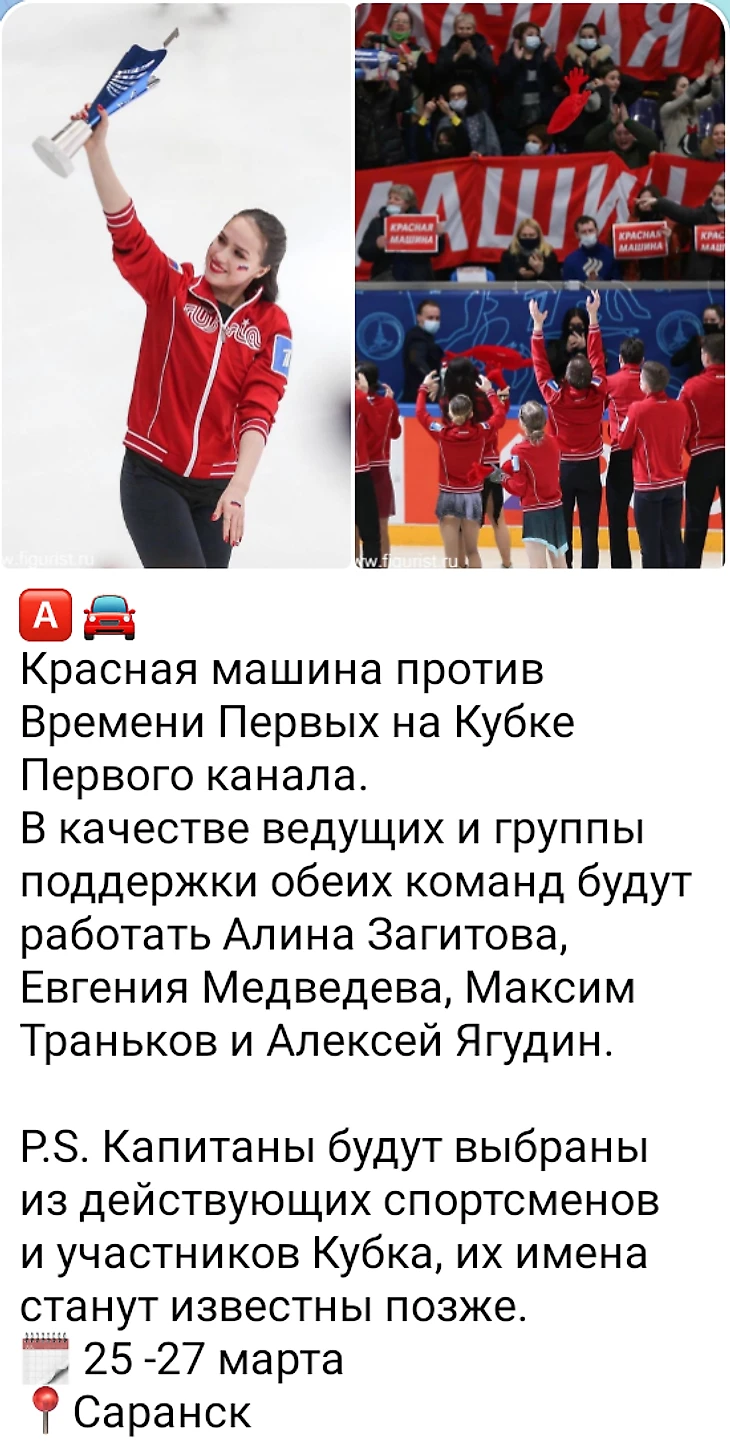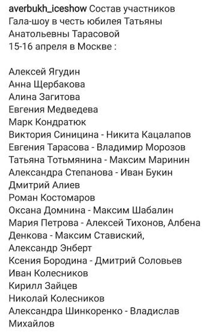 Сегодня Илья Авербух анонсировал состав на Гала-вечер, посвящённый юбилею Т.А.Тарасовой 15-16 апреля в Мегаспорте. В списках есть и Алина Загитова. конечно, может он опять ошибся, но на данный момент информация пока такая:
