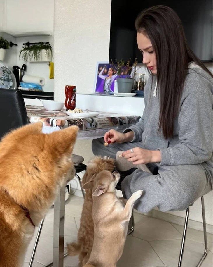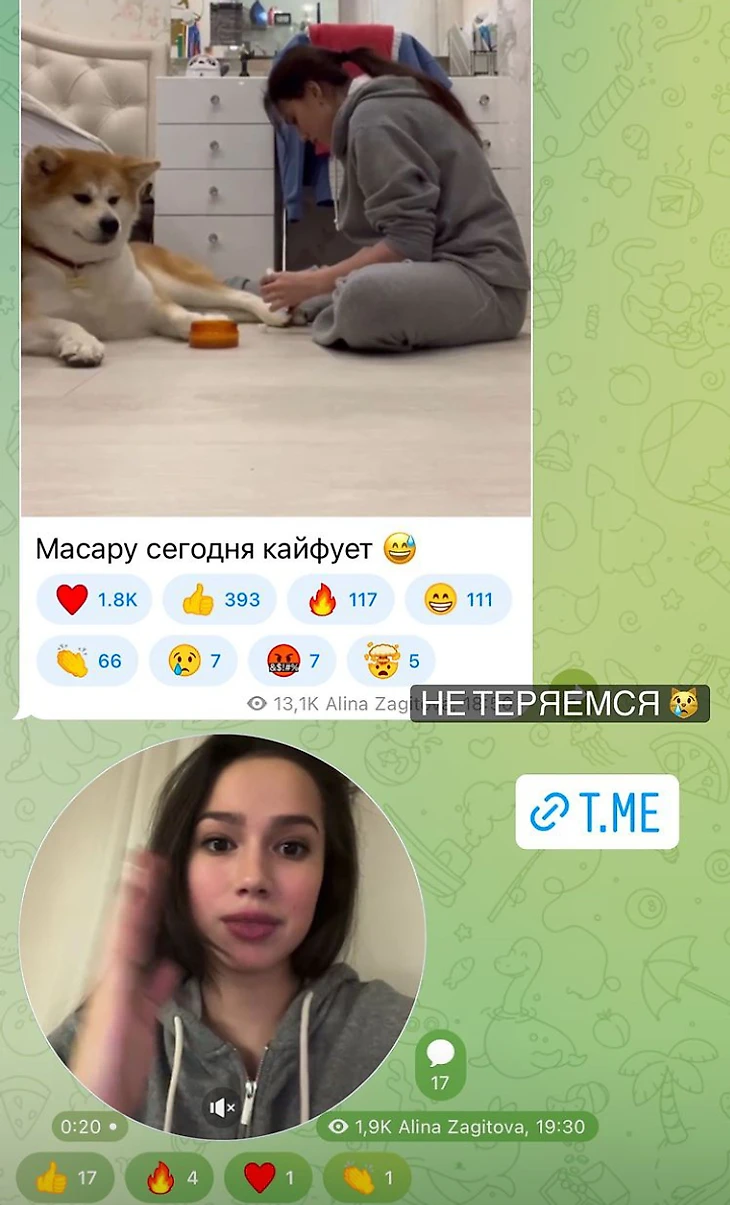 Сегодня Алина Загитова продолжала выкладывать контент в своём телеграмм, видео с этим контентом размещаю ниже. Тренировки, домашние питомцы и прочее. Нам интересно всё!