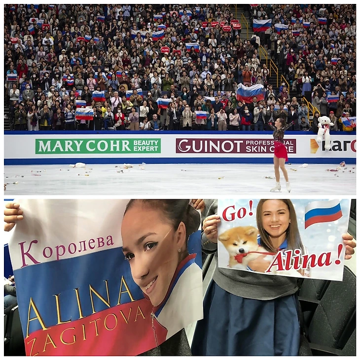 Зал , реакция зала меня впечатлила .Зал сопереживает с Алиной и в соревновательных прогах и в показательном выступление .Удивительное единение и такое множество табличек с именем Алина.Много у неё болельщиков и почитателей таланта в мире.