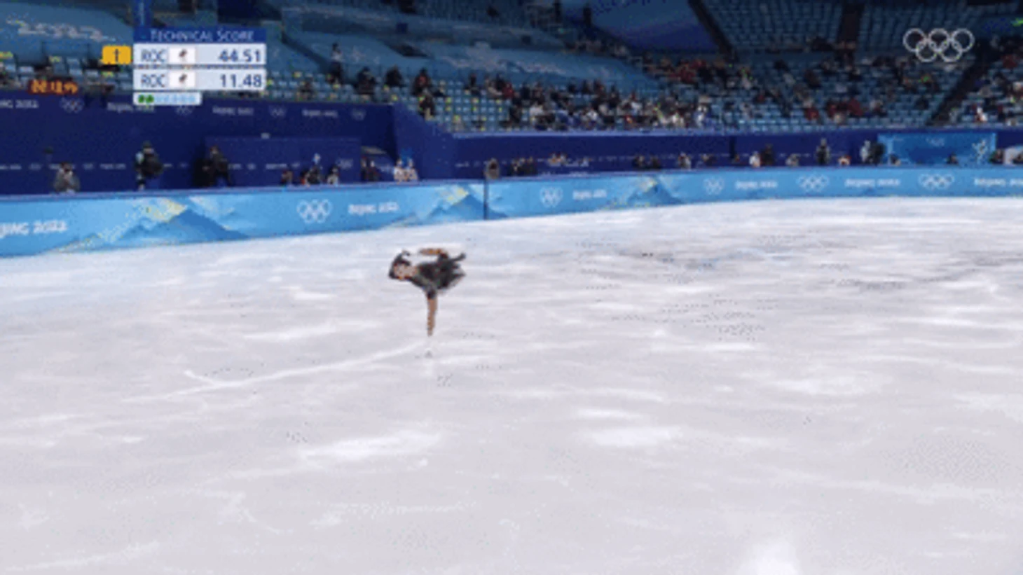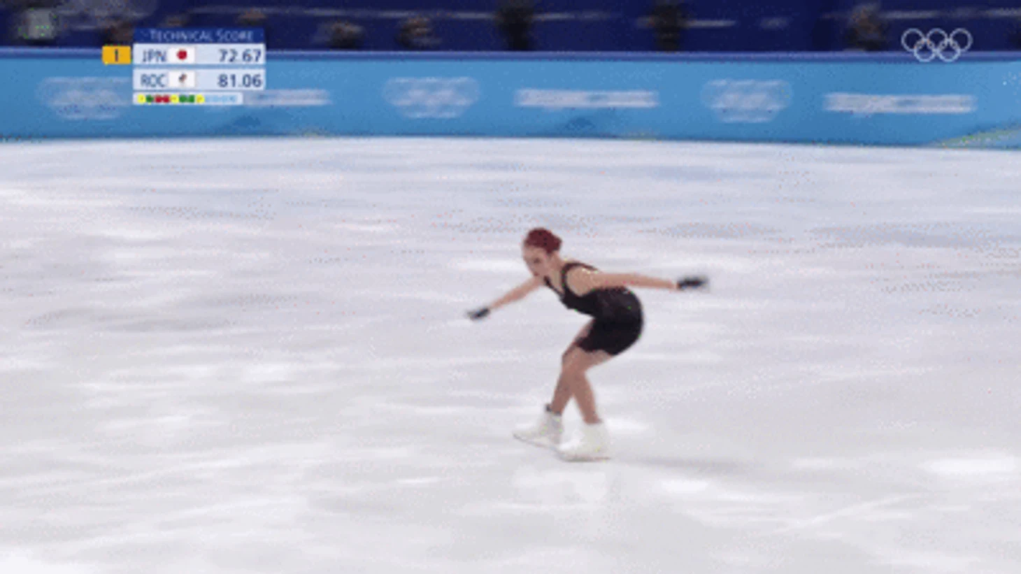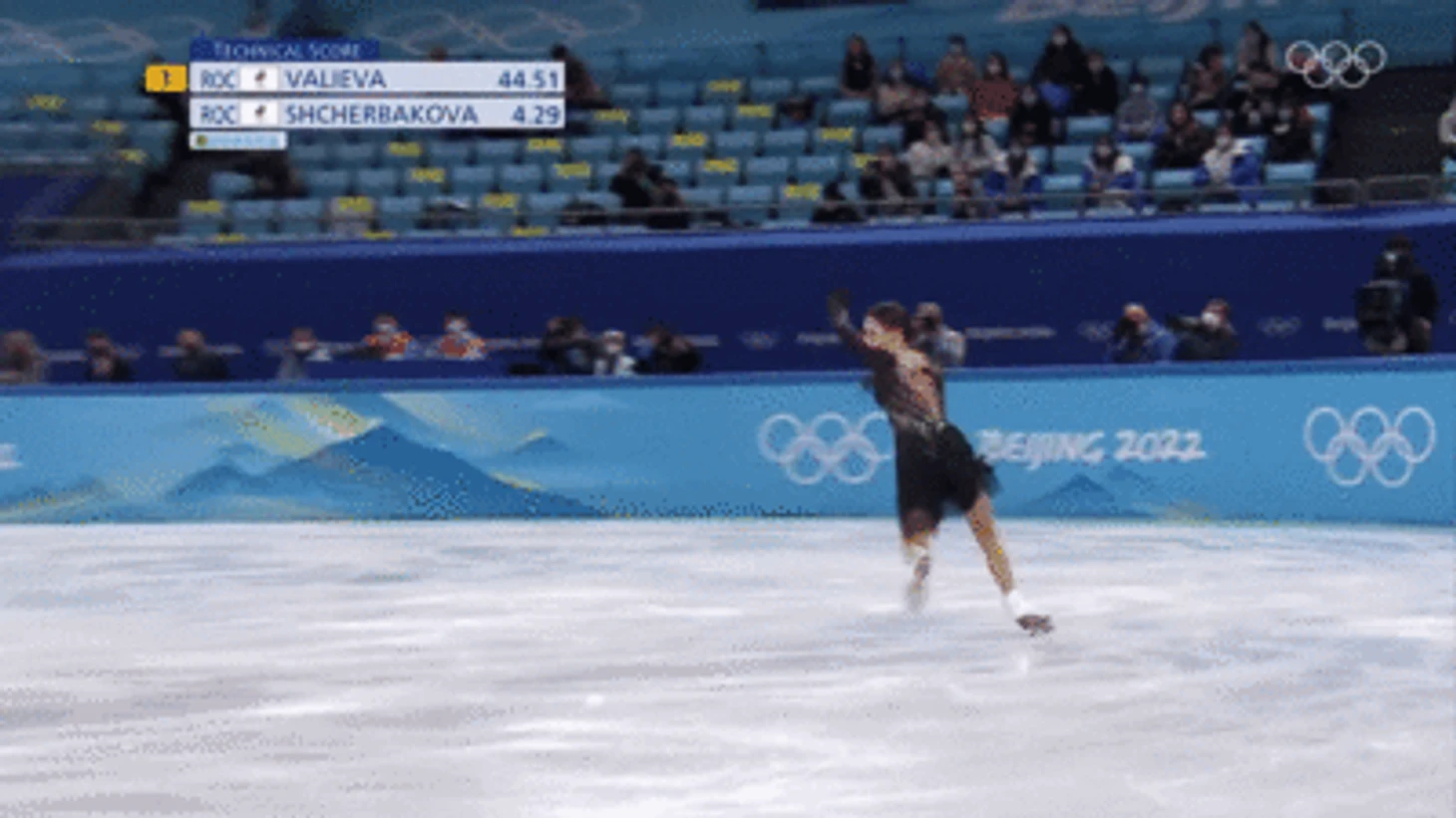 Здесь Щербакову сносит чуть меньше по катку, и позицию она фиксирует быстрее. Но в целом качество вращения низкое. Оценка гое -1, 2,88 балла за вращение. Вычет из техники получается 1,28 балла.