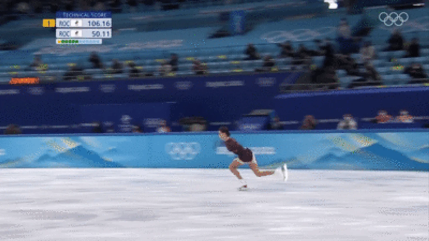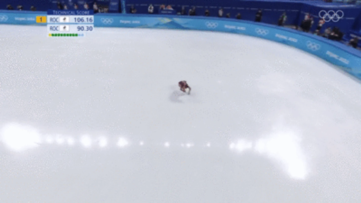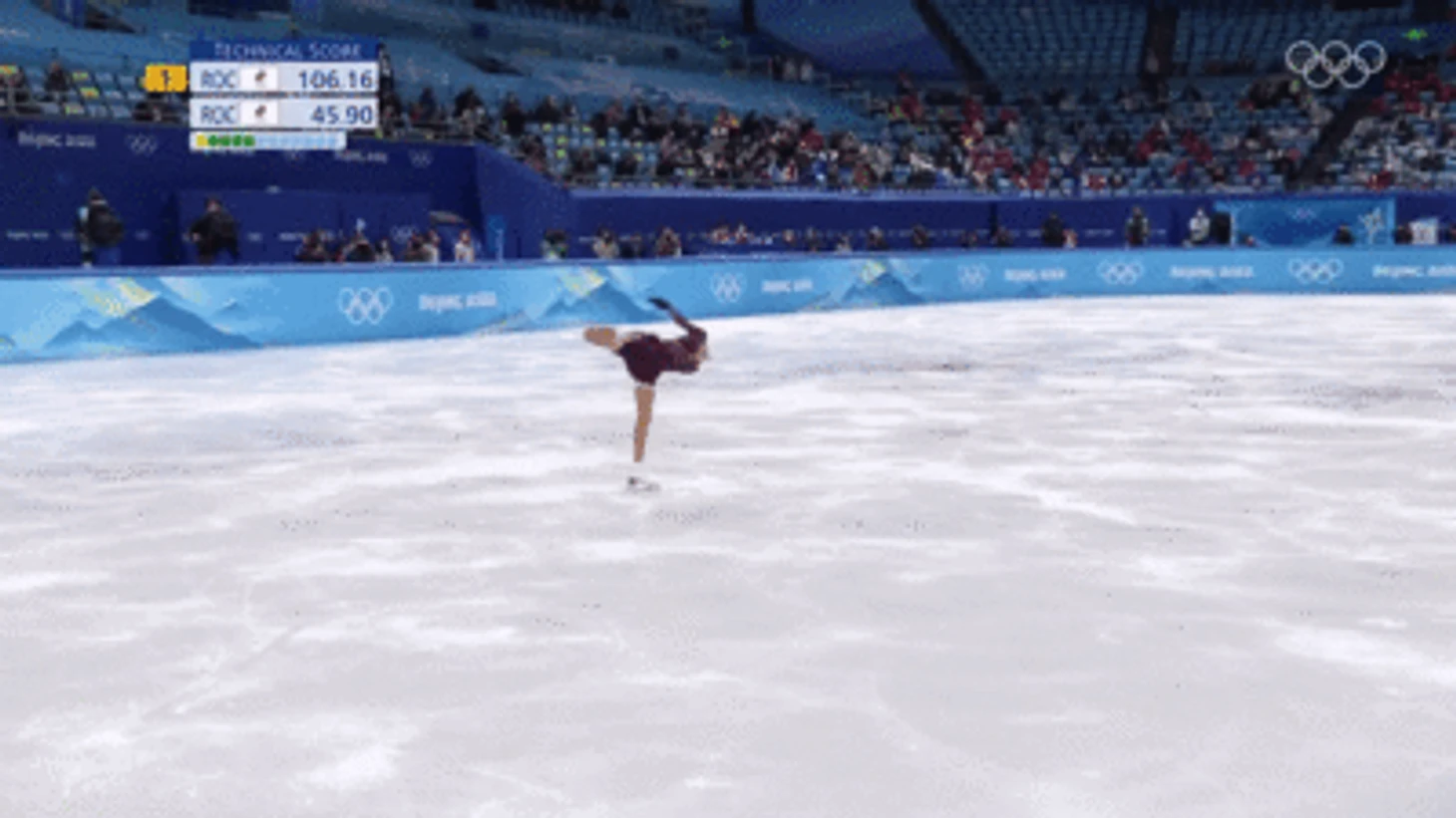 Здесь Щербакову сносит чуть меньше по катку, и позицию она фиксирует быстрее. Но в целом качество вращения низкое. Оценка гое -1, 2,88 балла за вращение. Вычет из техники получается 1,28 балла.
