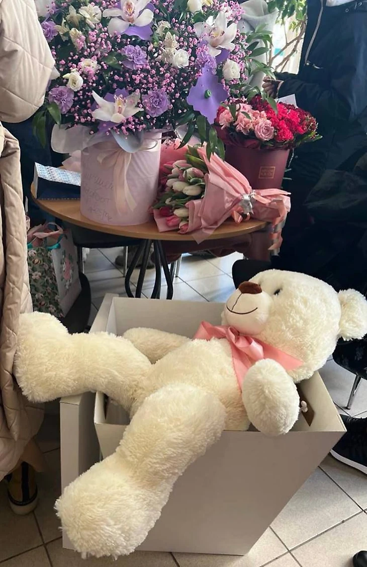 Болельщики подарили серебряному призеру Олимпиады море подарков, в том числе цветы и огромного плюшевого медведя.