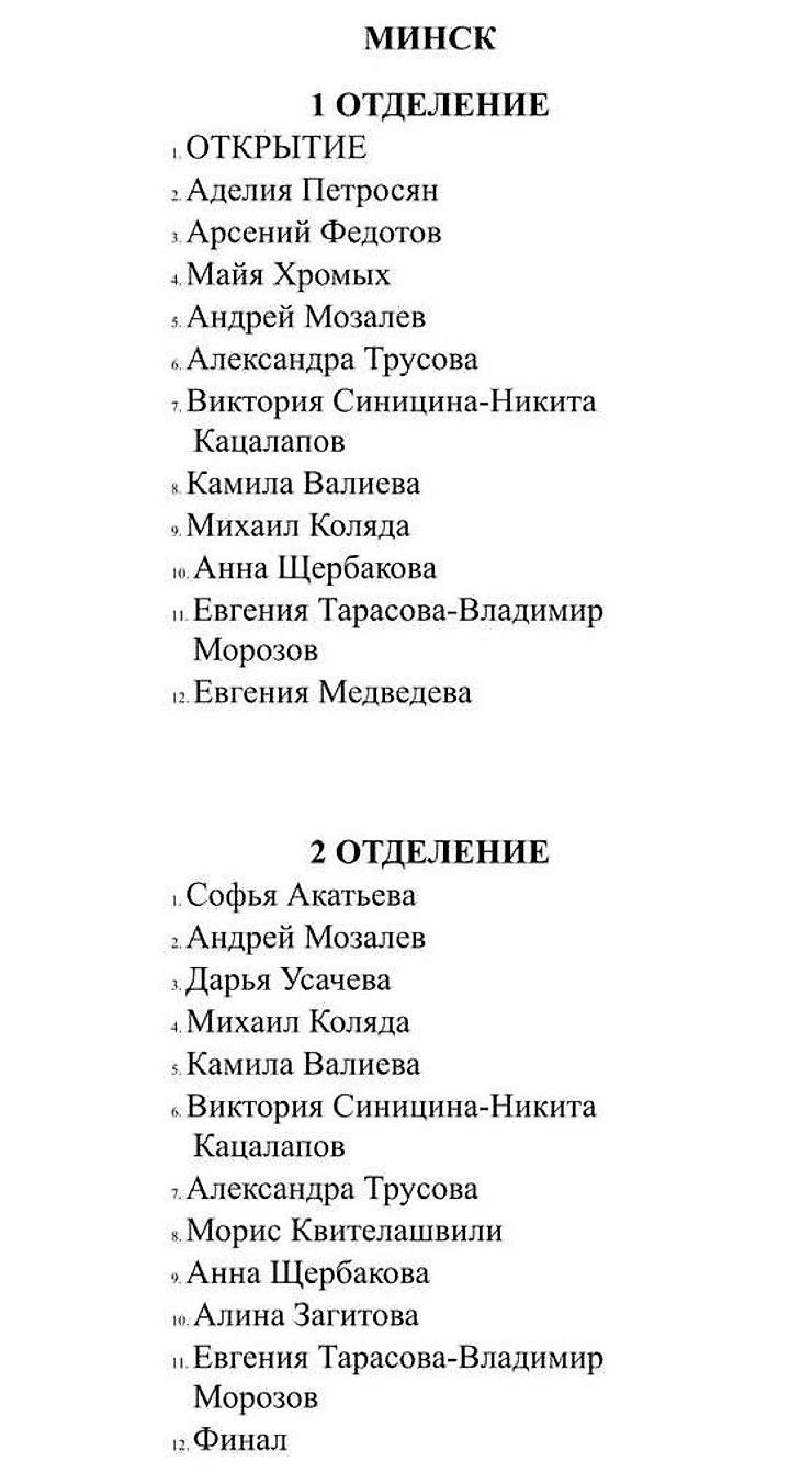 У Алины запланирован показ двух программ: КП сезона 19/20 "My Voy" и некая новая программа, премьера которой, скорей всего, будет показана на шоу в Москве. Несомненно все мы в предвкушении премьеры, ведь в этом году не было традиционного фото тизера, который публиковали в соц сетях Алина или Даниил Глейхенгауз. Тем и интереснее, что же будет показано Алиной в Минске! Очень ждём! И удачи наше Алине!