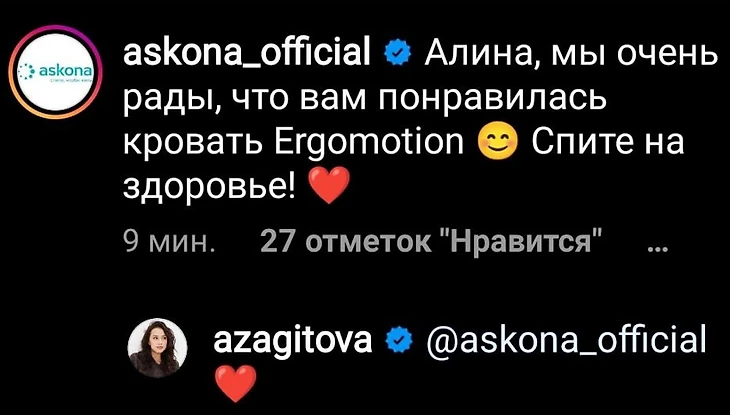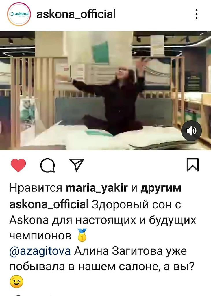 Сегодня, 12 апреля, был опубликован рекламный ролик бренда "Аскона" с участием Алины Загитовой