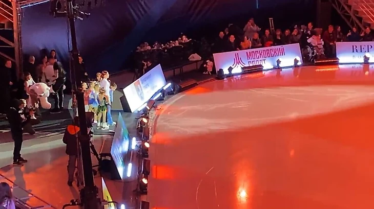 Начиналась программа за пределами льда: Трусова стояла среди маленьких фигуристок.