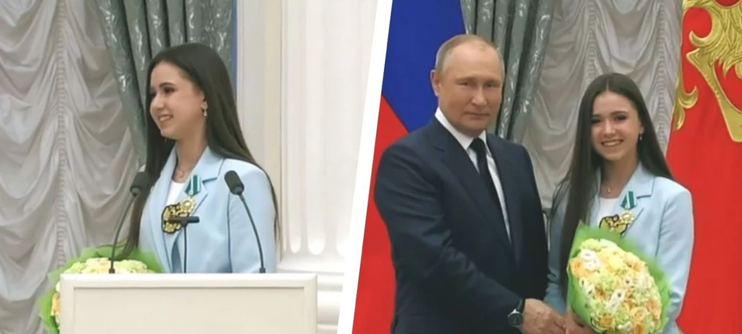 Следом состоялась личная встреча олимпийских чемпионов командного турнира с Владимиром Путиным. Камила Валиева выступила с речью, получив «Орден Дружбы» 👇🏻