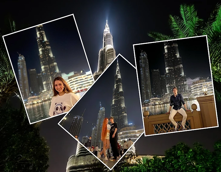 Камила Валиева, Морис Квителашвили, АлександраТрусова и Марк Кондратюк на фоне небоскрёба Бурдж-Халифа в Дубае.