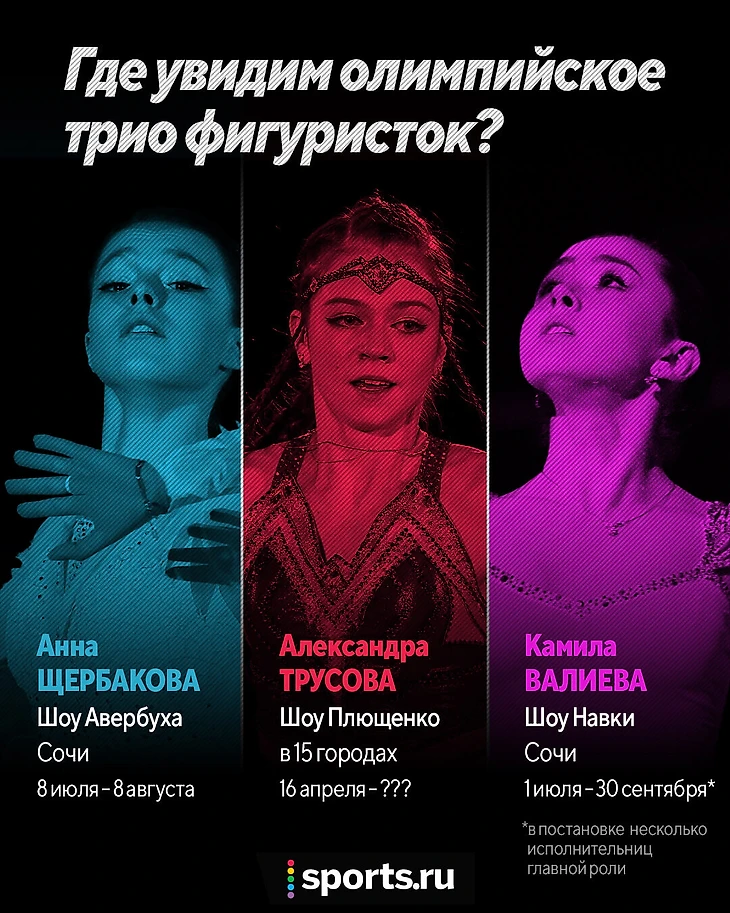 Где теперь смотреть Трусову, Валиеву и Щербакову? Саша вернулась к Плющенко, у Ани – 24 шоу за месяц, а Камила в команде с Навкой и Загитовой