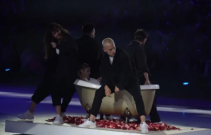 Билан исполнял в центре площадки песню «Держи», а Алена появилась на льду на подвижной платформе, сидя в ванне и в сопровождении четверки танцоров.
