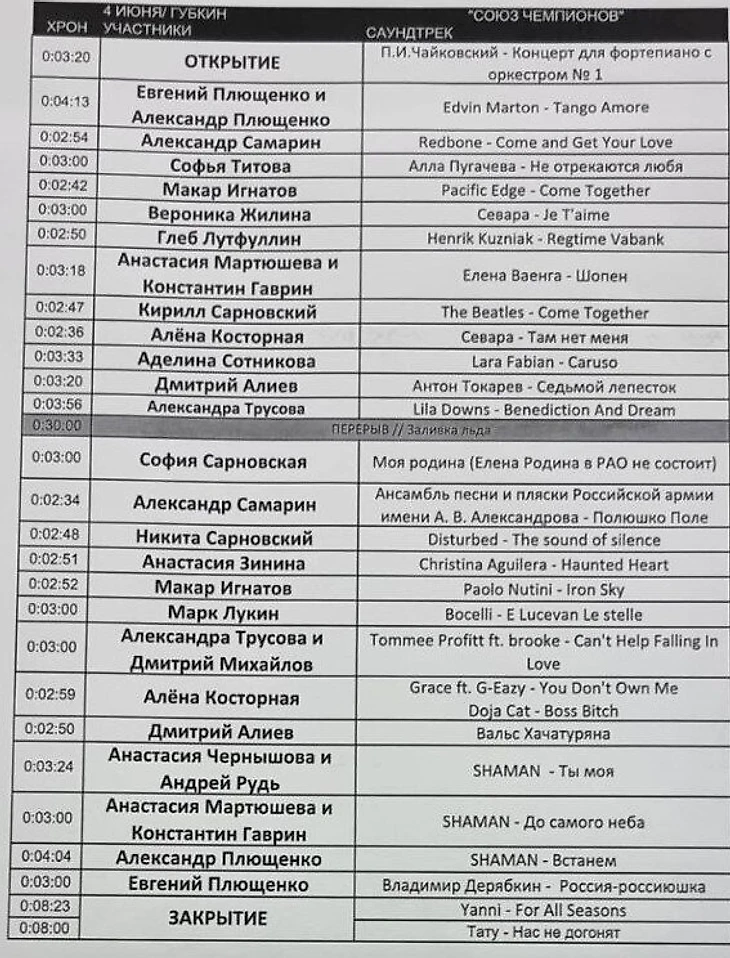 На самом деле, баланс патриотичных и не совсем патриотичных песен в «Союзе чемпионов» не так категоричен, как в техническом описании Плющенко: прокаты под Билана, Ваенгу и певца под именем SHAMAN чередуются с The Beatles, Кристиной Агилерой, Леди Гагой и Ларой Фабиан.