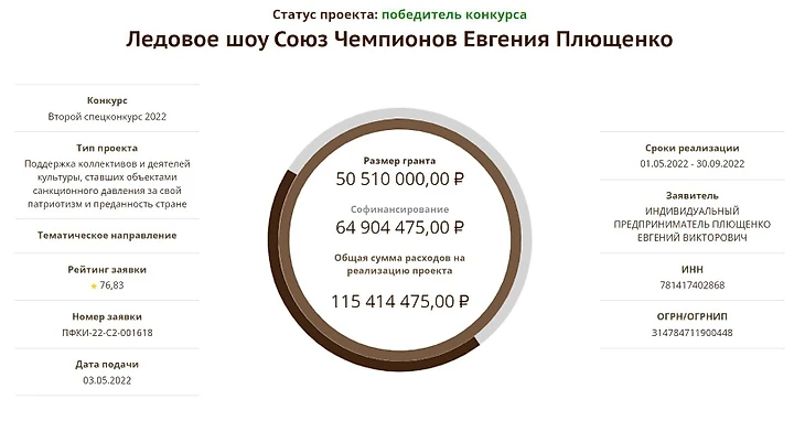 • Процедура получения грантов сложная и многоступенчатая. Конкурс, который выиграл Плющенко – второй в 2022 году, а прием заявок на него шел с 20 апреля по 7 июня. Интересно, что шоу Плющенко стартовало до того, как открылся прием заявок.