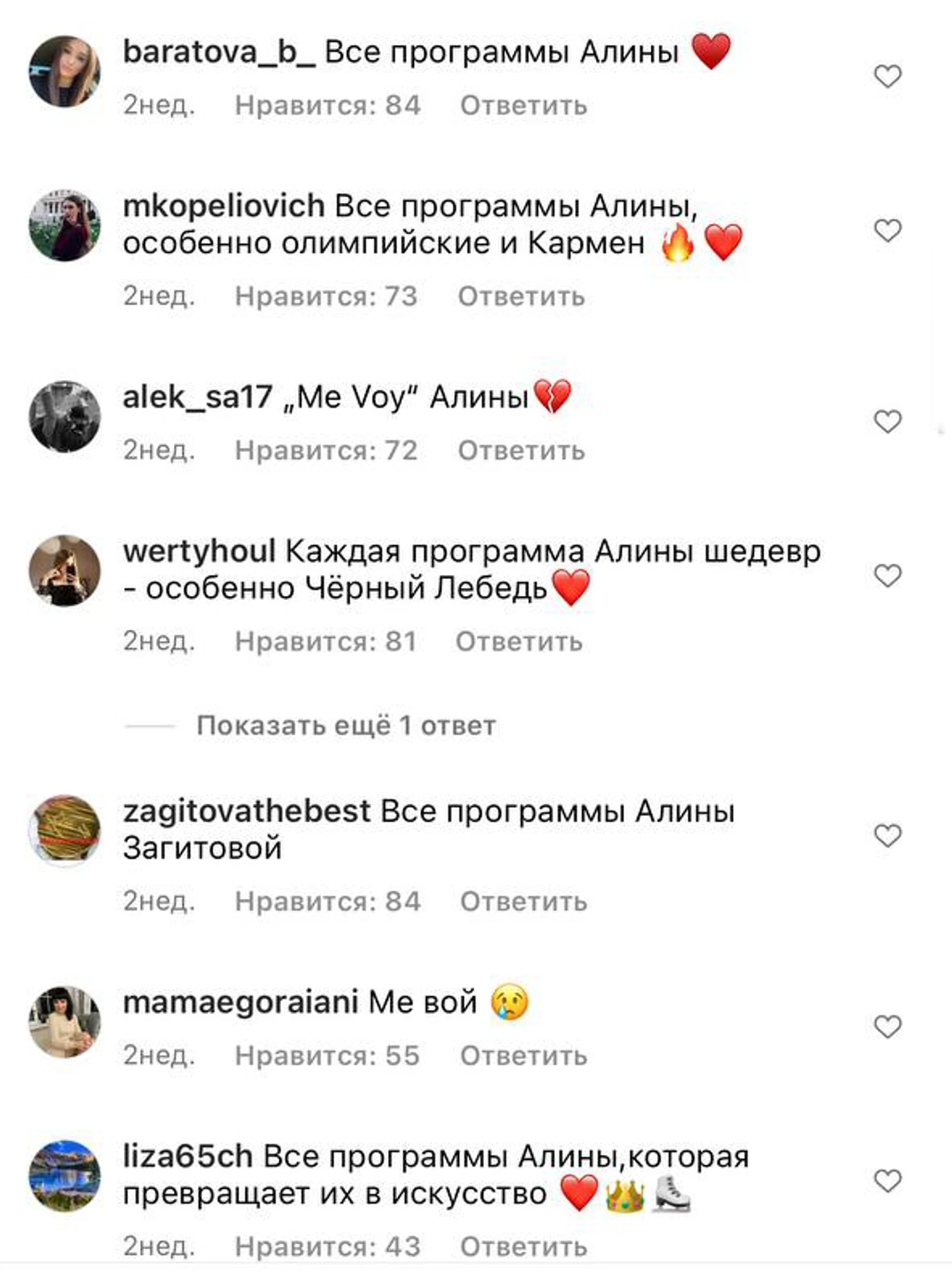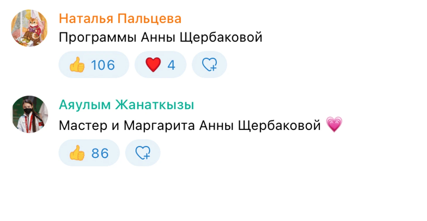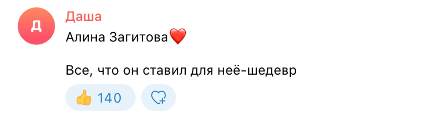 И снова в нашем опросе вы не смогли остановиться на одной постановке для Алины. В соцсетях мелькали самые разные варианты: от олимпийских до показательных. Но чаще всего поклонники вспоминали «Черного лебедя», «Кармен» и «Me Voy».