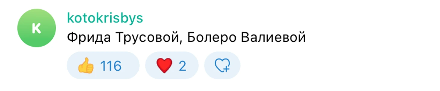 Безусловным фаворитом стала короткая программа Саши Трусовой «Фрида». Пожалуй, ни одну программу этого сезона не хвалили так часто, как эту. Стопроцентное попадание в образ и наши сердца.