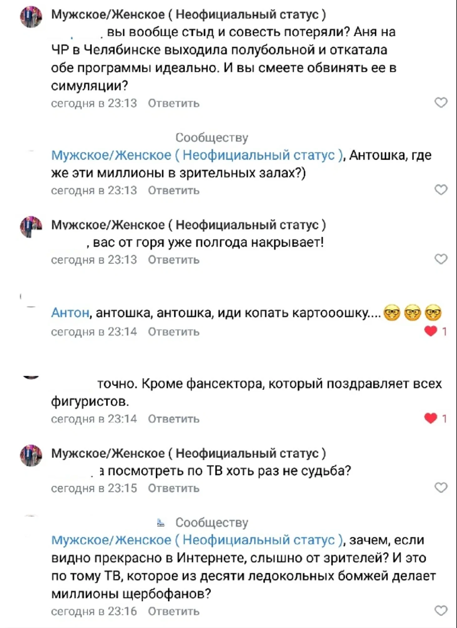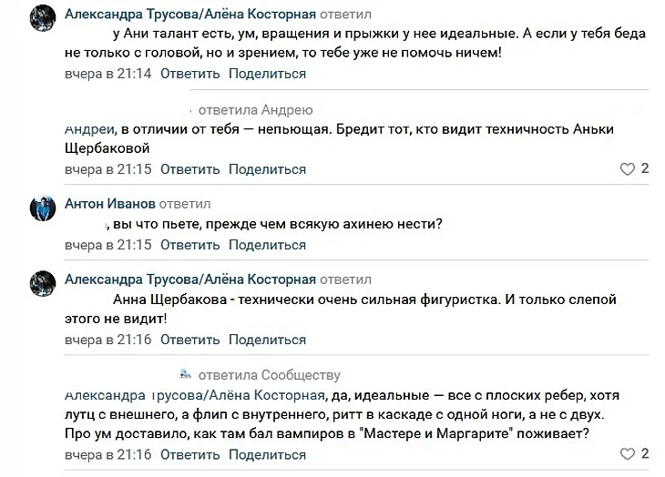 Просто кого-то слишком задевает тот факт, что Сашу любят в разы больше, чем заласканную федерацией Щербакову. По-настоящему любят, ходят ради нее на соревнования и шоу, а не покупают кучу ботов на том же «Спортсе» или назначают админами фан-групп персонажей, которые могут только требовать и заставлять (!) любить Анну Щербакову. Потому что у Анны Щербаковой поклонников толком нет, есть лишь фикция в Интернете.