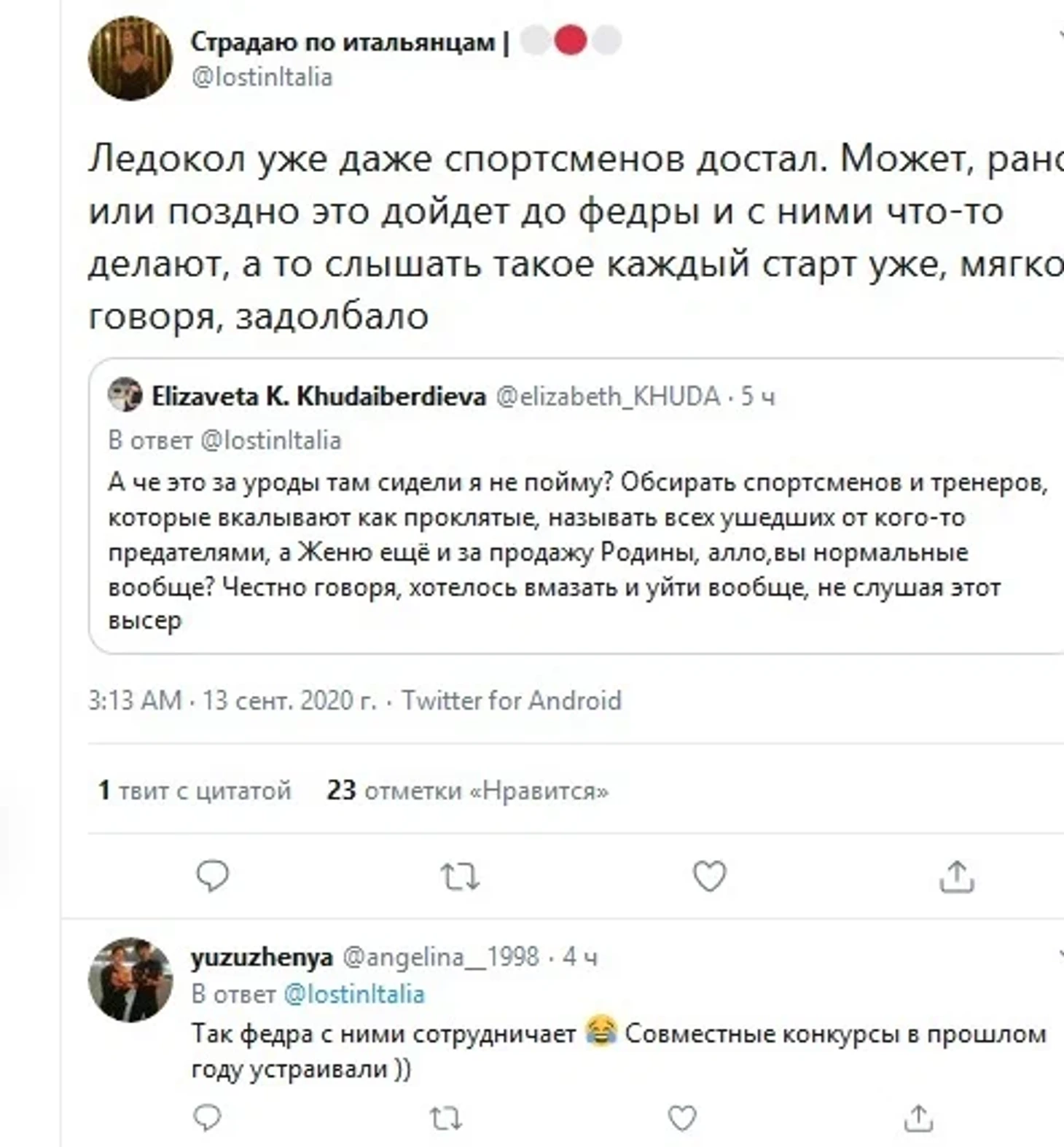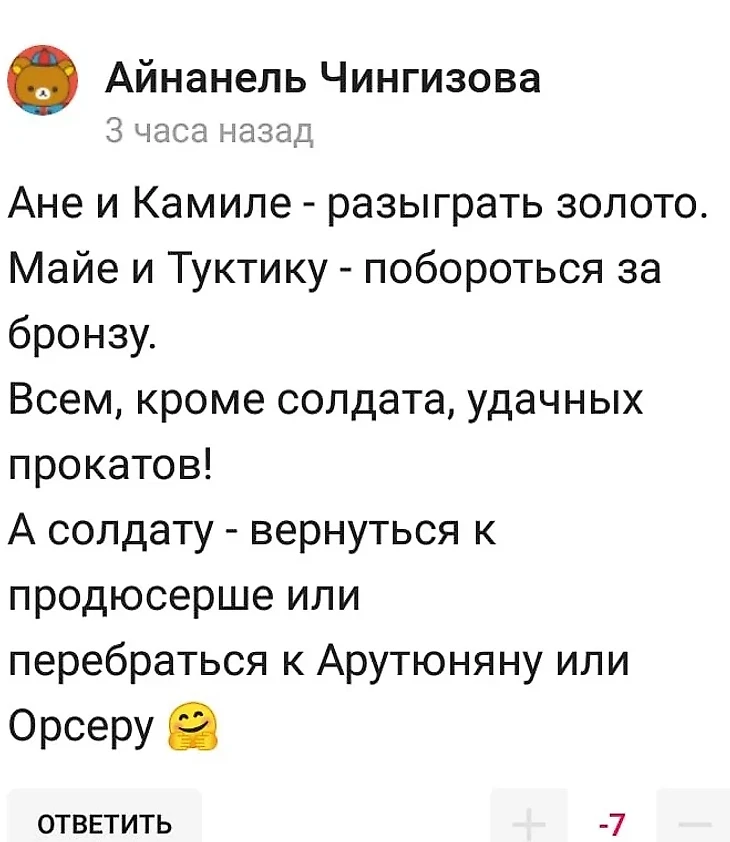 Например, у известного на «Спортсе» Беглого Уголовника минимум еще два аккаунта – Айнанель Чингизидова и TheWitcher. Под любым постом эти три аккаунта выдают на-гора тонны хейта в адрес Александры Трусовой, попутно восхваляя Анну Щербакову.