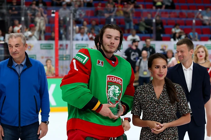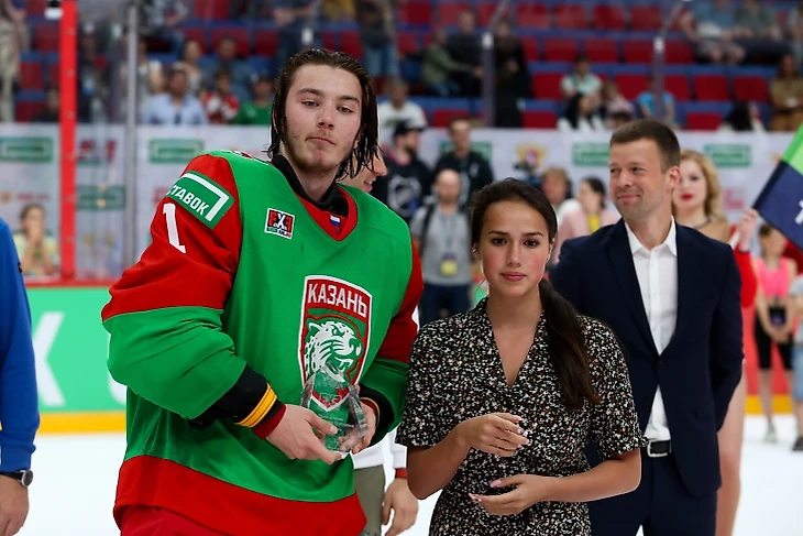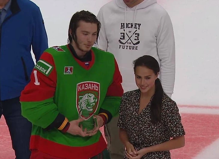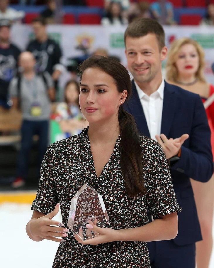 Алина Загитова на награждении после сегодняшнего хоккейного матча