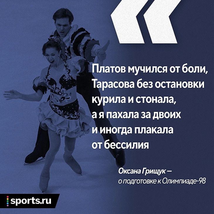 – Я в любой ситуации хочу вспоминать только хорошее. Но олимпийский сезон — это всегда нервы. А тут это было вдвойне или втройне. Каждый переживал нашу ситуацию по-своему: Женя страдал от боли и мучился, что нас подведет; Тарасова без остановки курила и стонала; а я пахала за двоих и от бессилия иногда плакала. Мне было очень страшно, что мы не сможем подготовиться, что Женя в самый важный момент упадет и мы проиграем... Я жутко боялась потерять титул. Четыре года мы были первой парой в мире, и тут корона может упасть с наших голов.