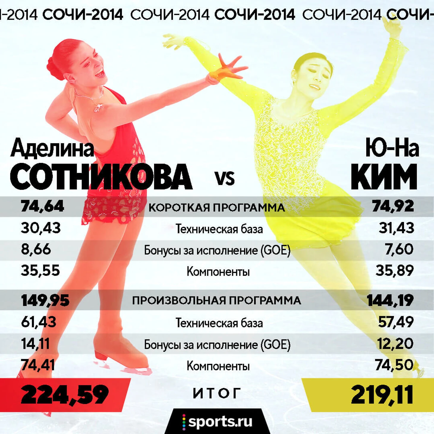 Но оценка за компоненты для Сотниковой действительно получила мощную прибавку к личному рекорду – на международных стартах ей никогда не ставили больше 70 баллов. Даже при домашнем судействе на победном чемпионате России было меньше (всего 73,38). Но прибавила в компонентах и Ю-На – за год до Олимпиады на победном ЧМ ей выдали всего 73,61 балла.