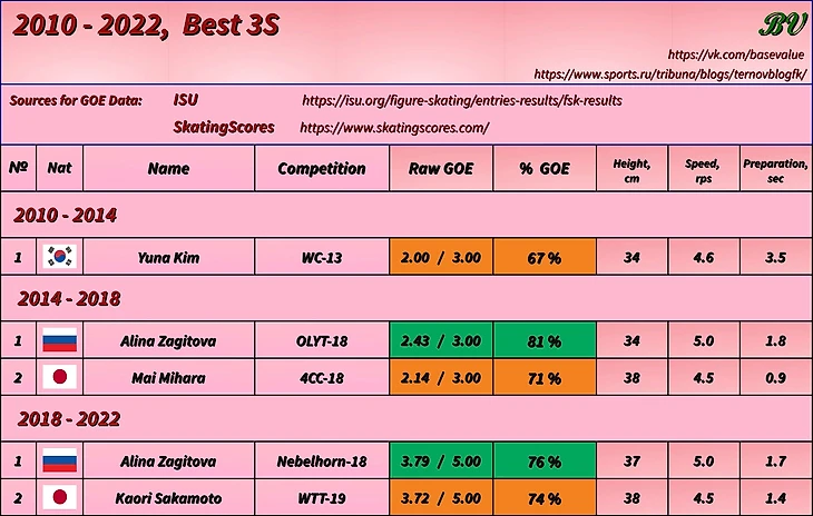 ПЕКИНСКИЙ ЦИКЛ (2018 - 2022) 2 МЕСТО. Каори Сакамото (WTT 2019). ГОЕ 3.72 из 5.00 Шок-контент, у нас первый рейтинг по прыжкам который Сакамото не выиграла с большим отрывом. Как ни странно. Заход стандартный, но как всегда на большой скорости. Высота 38, крутка 4.5, и скоростной выезд с эпичными переступаниями на ход назад 1 МЕСТО. Все еще Алина Загитова (Nebelhorn 2019). ГОЕ 3.79 из 5.00 Не так много времени прошло между двумя лучшими попытками, но эта оценивалась уже по новой шкале. Здесь заход обычный, прыжок вновь с риппоном, высота 37, крутка 5.0. На этот раз в музыкальный акцент четко попал выезд, он также усложнен выкрюком и перепрыжкой Проценты ГОЕ: Ким 67 % --— Загитова 81 % Михара 71 % --— Загитова 76 % Сакамото 74 %