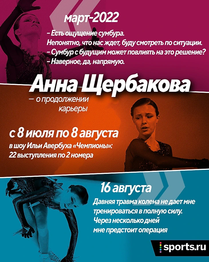 Олимпийская чемпионка и чемпионка мира Анна Щербакова объявила о предстоящей операции на колене – завтра вылет в Германию.