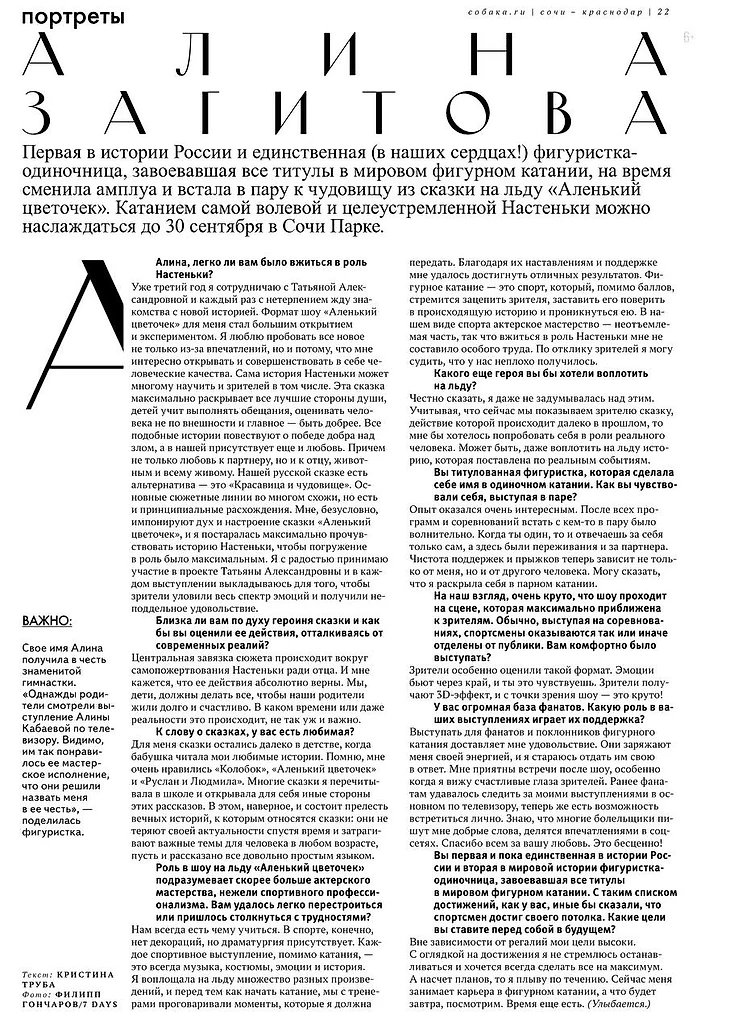 Новое интервью Алины Загитовой изданию собака.ru/ сочи-краснодар