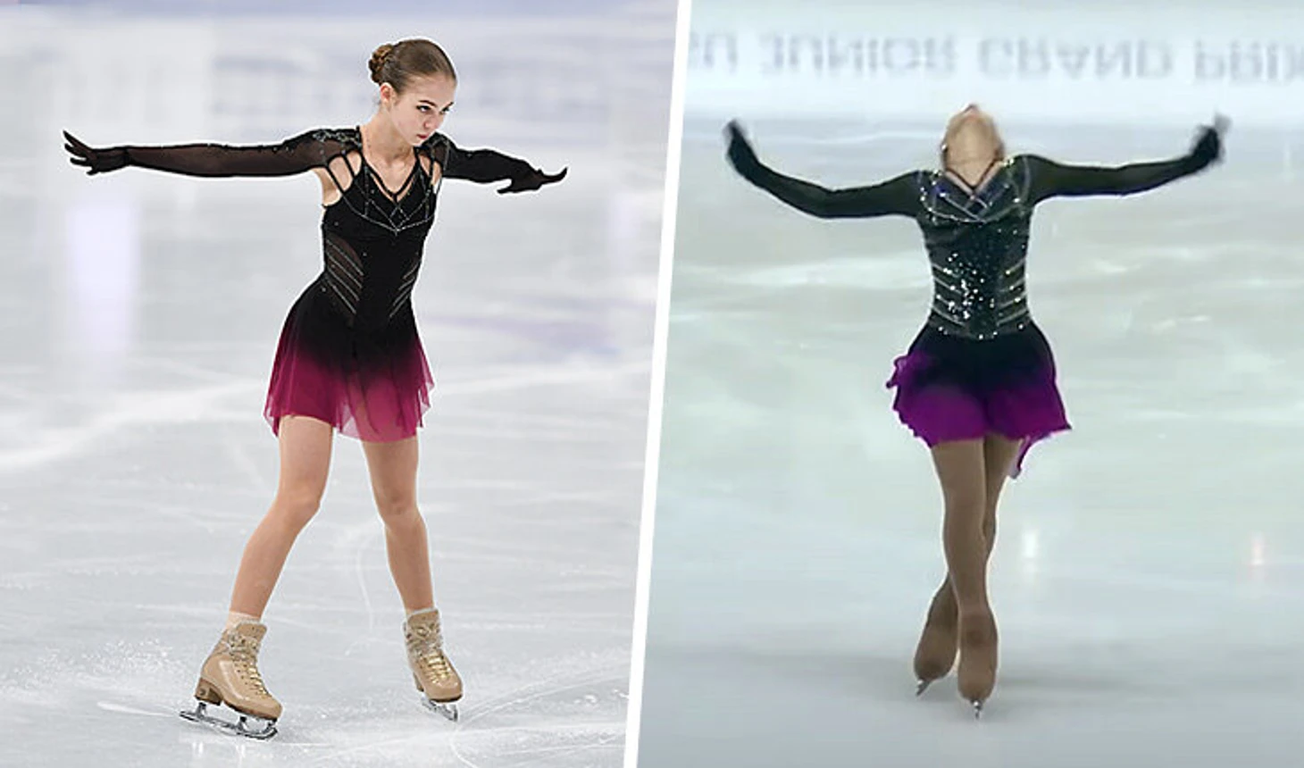 С нарядом-репликой на лед вышла фигуристка из Казахстана Карина Иссакова. Отличий не так много: на юбке вместо бордового – фиолетовый, у платья Иссаковой полноценные рукава (у Трусовой подмышки были открыты), стразы на спине кажутся чуть ярче.