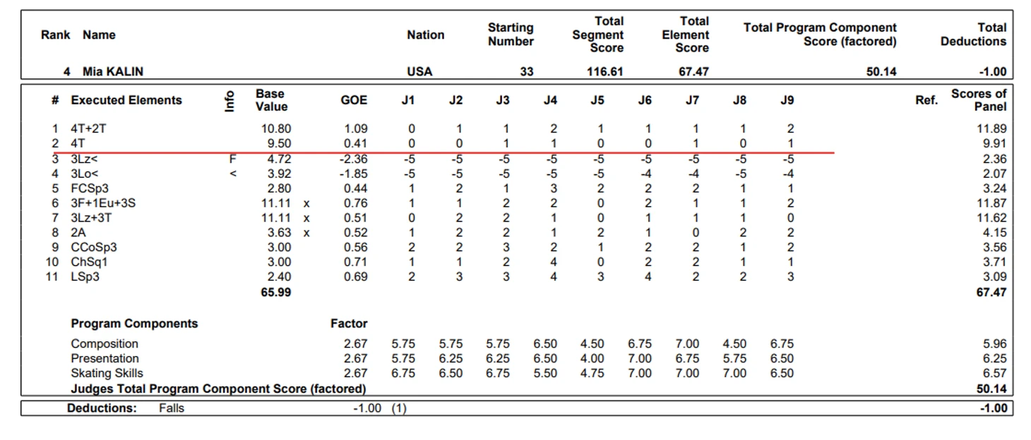 • Есть и еще одна проблема – низкие компоненты. Особенно поражает разница в произвольной программе. По второй оценке Калин уступила Икуре Кушиде, Мин Соль Квон и Мао Шимаде 7, 8 и 12 (!) баллов соответственно. В протоколе у Миа нет ни одной оценки выше 7,0, да и они редкость. Скольжение и презентацию арбитры оценили в среднем на 6,25 и 6,57 соответственно.