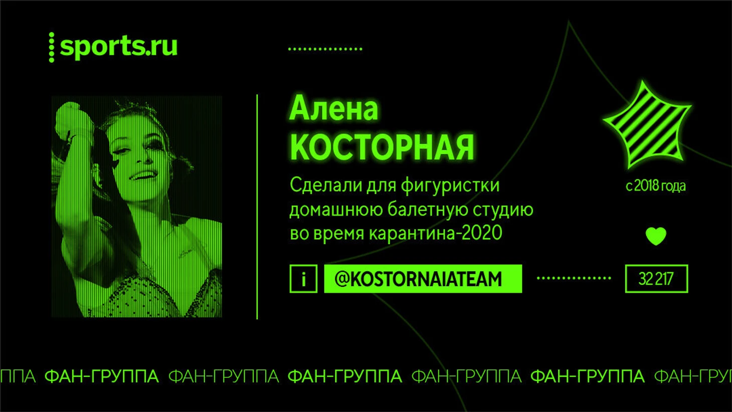В Kostornaia Team входят 32,2 тысячи человек, среди подписчиков и сама Алена – и это сообщество тоже отличается необычными подарками. В пандемию-2020 болельщики оборудовали домашнюю балетную студию для фигуристки: привезли станок, зеркало и специальное напольное покрытие.