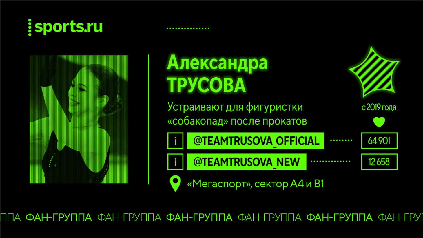 У Трусовой живое фан-сообщество ВКонтакте – официальная группа Александры Трусовой. В этом паблике хранятся видеозаписи всех выступлений, все интервью и публикации Саши в социальных сетях. Если что-то пропустили, вам сюда.