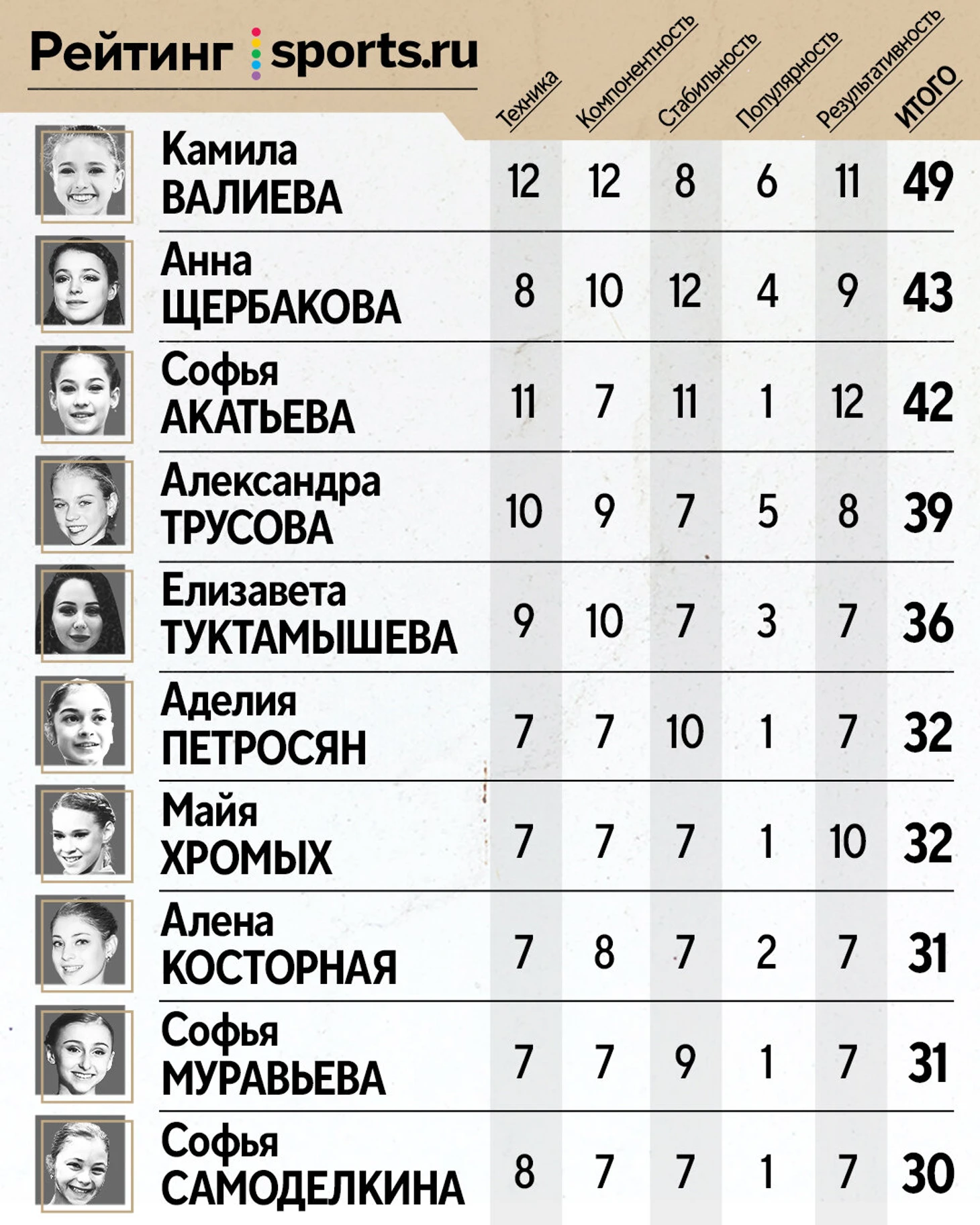 В основе рейтинга – результаты последнего ЧР, но чтобы учесть Софью Акатьеву (не выступала там из-за возрастного ценза) и Косторную (пропускала по травме), пришлось пожертвовать фигуристками, занявшими тогда 9-е и 10-е места – это Ксения Синицына и Вероника Яметова.