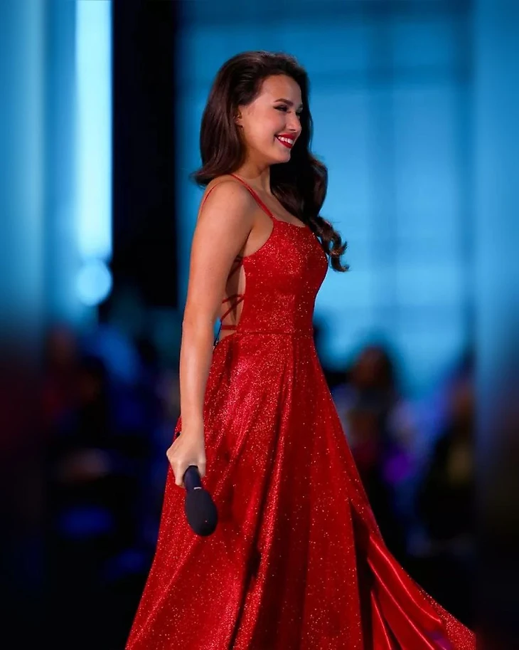 И вот главная тайна стартового выпуска раскрыта – Алина Загитова записывала подводки и общалась с участниками в сногсшибательном красном платье в пол на тонюсеньких бретельках и с открытой спиной.