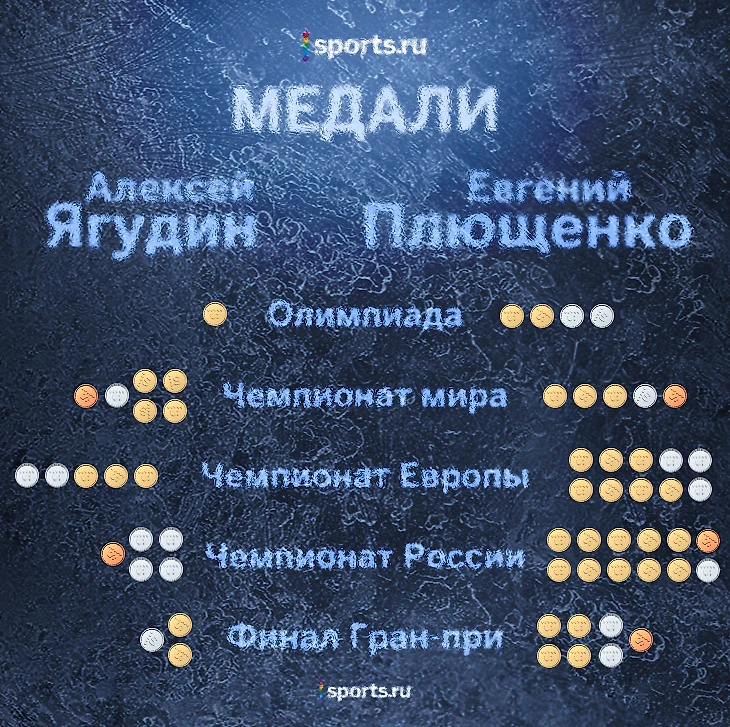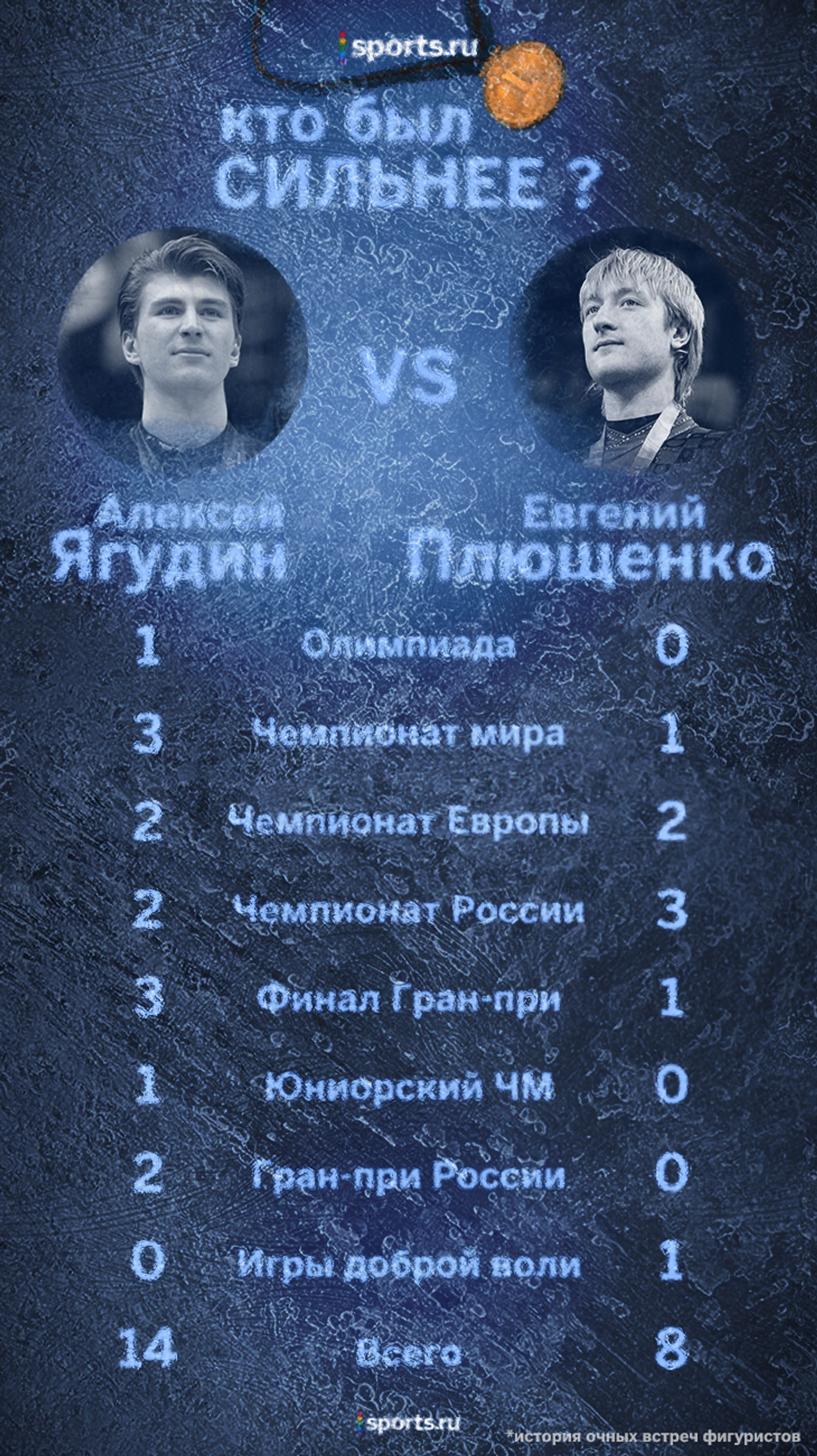 2. Ядовитая реплика, очевидно, задела Ягудина (и не только – Татьяна Тарасова назвала Плющенко идиотом). Алексей готовил ответ два дня, а главным аргументом выбрал картинку из текста Sports.ru 4-летней давности об истории их взаимной ненависти. В ней указывалась статистика очных противостояний Ягудина и Плющенко (кто выше на любых турнирах) – с общим счетом 14-8 в пользу Алексея.