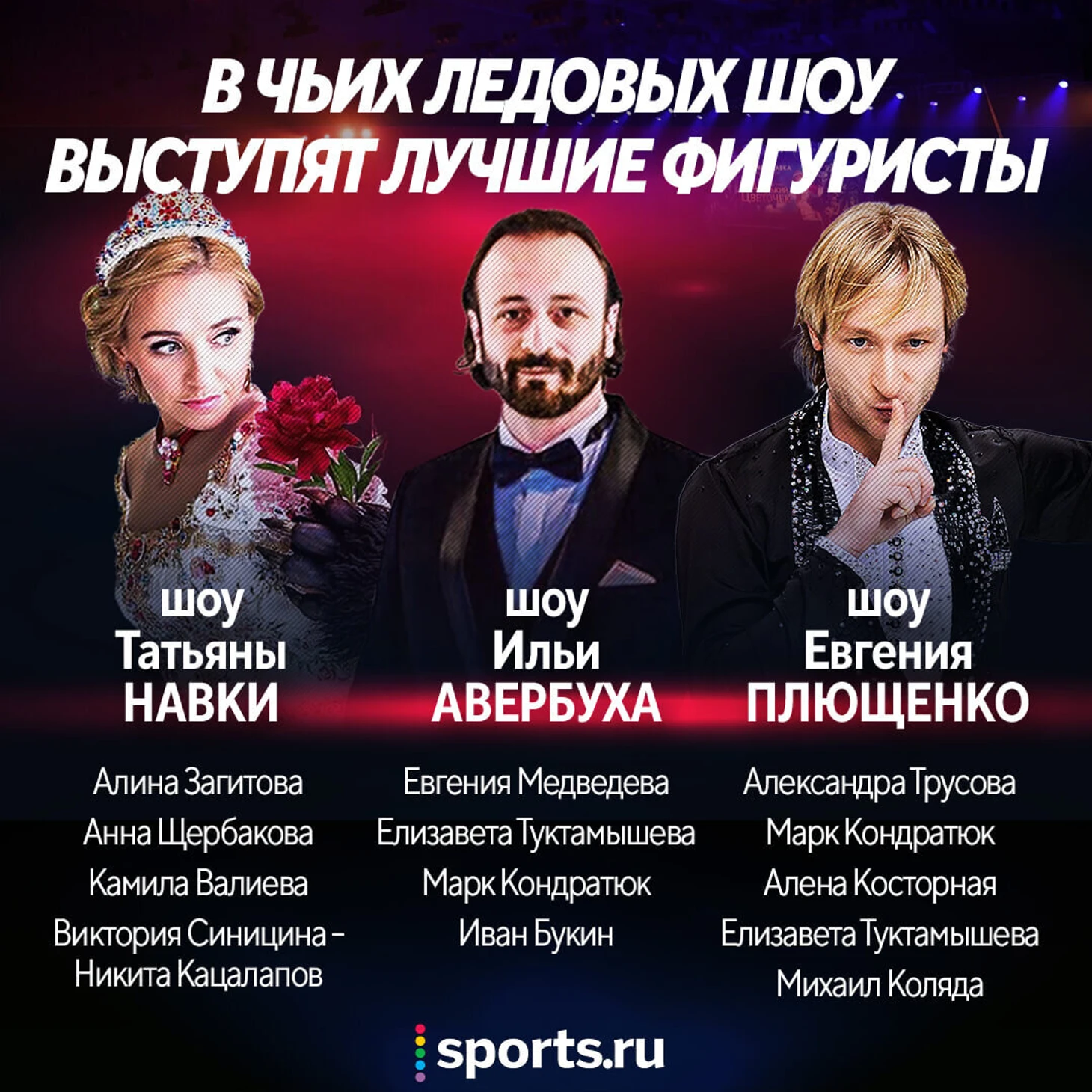 В этом году проекты привычно поделили три главных организатора-постановщика: Татьяна Навка, Евгений Плющенко и Илья Авербух.