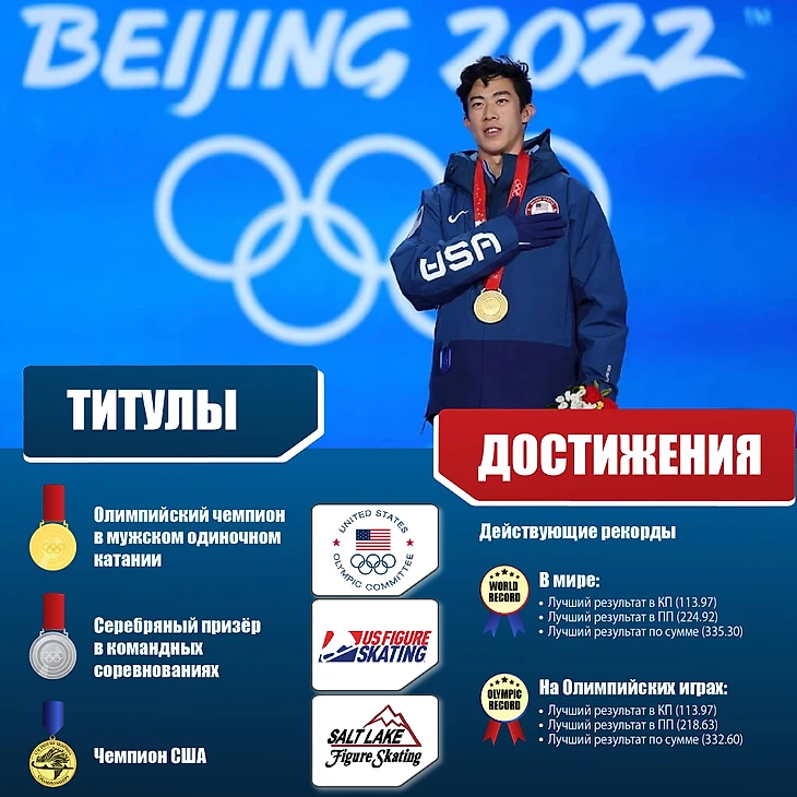 Нейтан Чен – олимпийский чемпион в мужском одиночном фигурном катании и серебряный призер командных соревнований на Олимпиаде в Пекине, рекордсмен мира. В короткой программе на Олимпиаде он исполнил самый сложный на данный момент контент и превзошел предыдущий рекорд более чем на 2 балла. Нейтан также является обладателем действующих мировых рекордов в произвольной программе и по сумме баллов. Результаты, показанные Нейтаном в Пекине, являются и действующими олимпийскими рекордами. Стоит также отметить, и об этом не забывает упомянуть американская пресса, что Нейтан стал первым фигуристом-мужчиной азиатского происхождения в сборной США, выигравшим Олимпиаду.