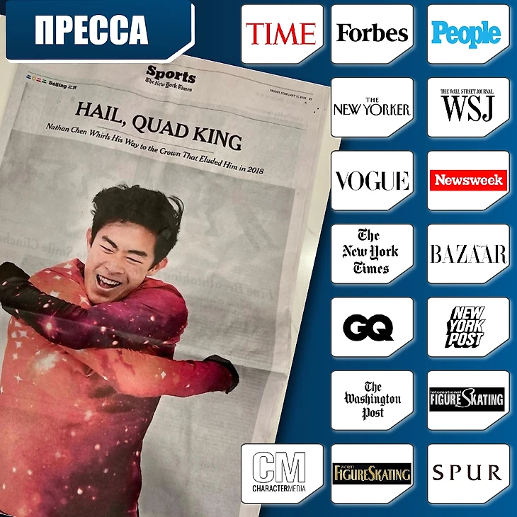 Надо ли напоминать, что сразу после победы на Олимпиаде Нейтан Чен стал одним из самых часто упоминаемых участников Игр в прессе и одним из самых желанных гостей на американском телевидении? Многочисленные газеты и журналы буквально выстраивались в очередь за интервью. В их числе были такие издания как New Yorker, Forbes, GQ, Teen Vogue. Радовали глаз болельщика и шикарные фотосессии для Vogue, японского Spur и журнала, посвященного популярным азиатам из индустрии развлечений, Character Media. На страницах глянца Нейтан предстал в нарядах от Prada, Dior, Valentino, Uniqlo и других модных брендов.