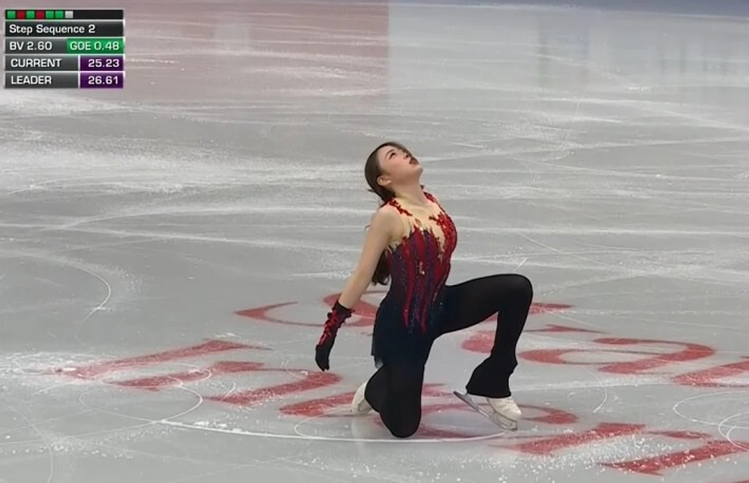 На льду пока все очень скромно – чистый двойной аксель, тройной сальхов – тройной тулуп (еле устояла на выезде с тулупа), тройной риттбергер (с ошибкой на выезде). В итоге только 59,27 балла за прокат – на подиум попасть будет сложно.