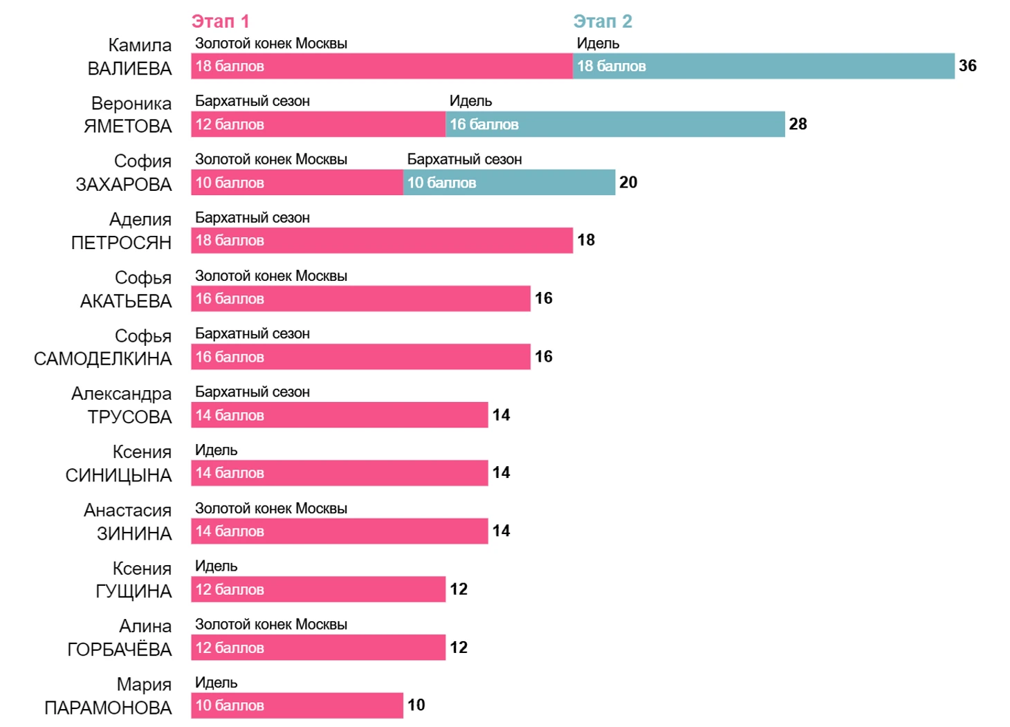 На сегодняшний день поучаствовать в двух этапах удалось не всем спортсменам, а, например, Елизавете Туктамышевой, еще только предстоит вступить в борьбу. Елизавету мы увидим уже завтра, 12.11.22 г. на "Гран При России Московские звезды", а список участниц, занявших на прошедших этапах места с 1-го по 5-е выглядит следующим образом: