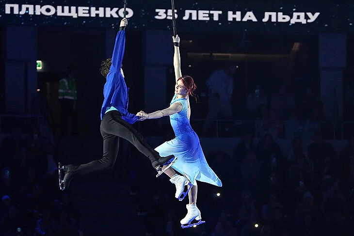 Пожалуй, главный номер вечера – почти цирковые трюки от Александры Трусовой и Марка Кондратюка. Они летали над ареной, держась за руки, а Саша висела вниз головой в шпагате.