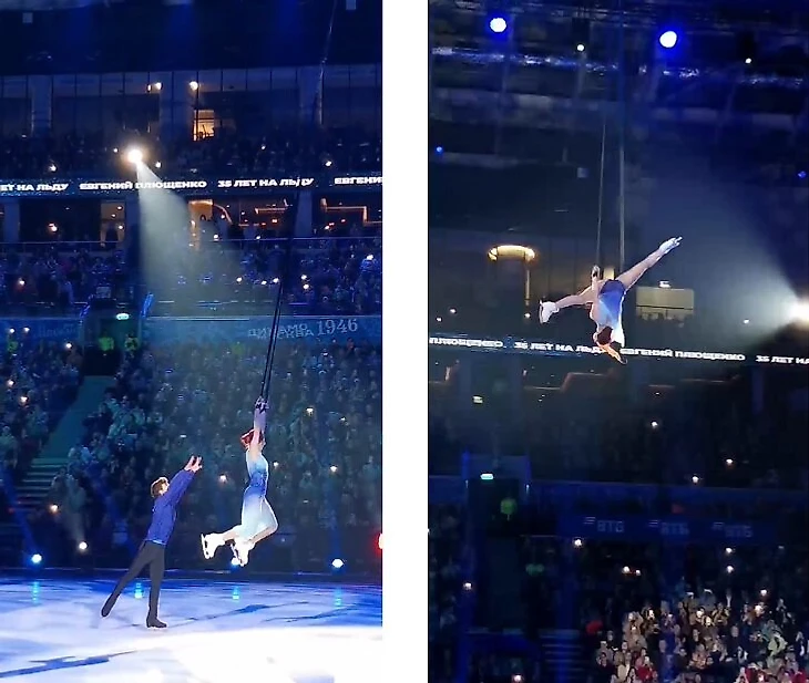 Под песню «Полетели» Трусова и Кондратюк и правда взлетали вверх. Они взялись за цирковую лонжу и закружились над ареной.