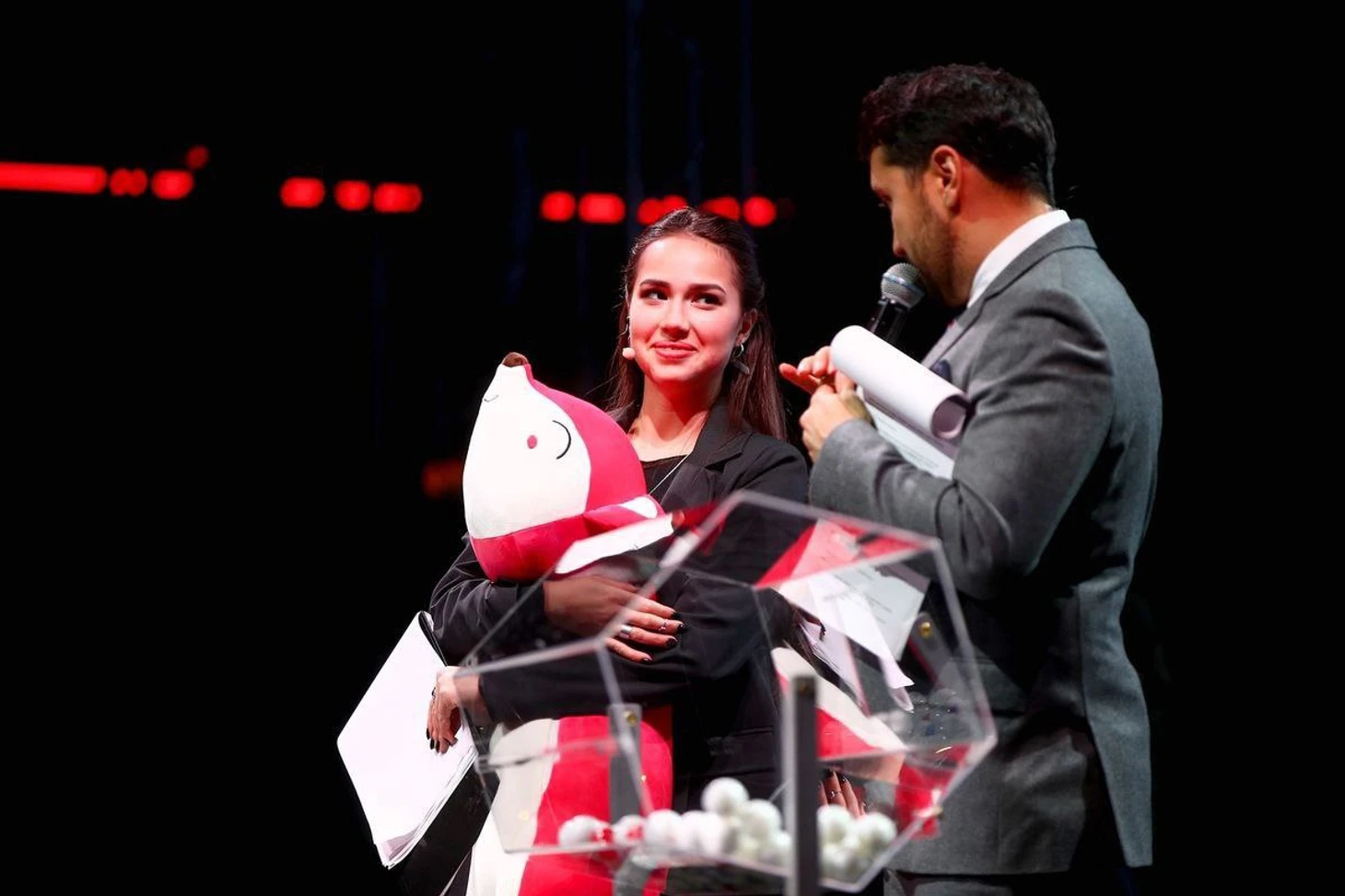 (Алина Загитова со своим соведущим, Кириллом Царевым, заместителем Германа Грефа, председателя правления ООО «Сбербанк»)